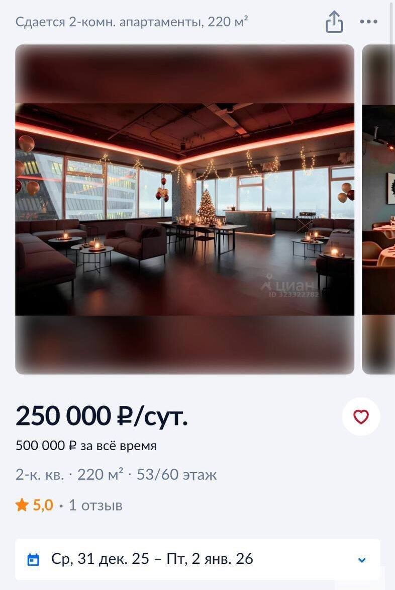 Апартаменты на праздник сдаются по 250 000 ₽ в сутки!