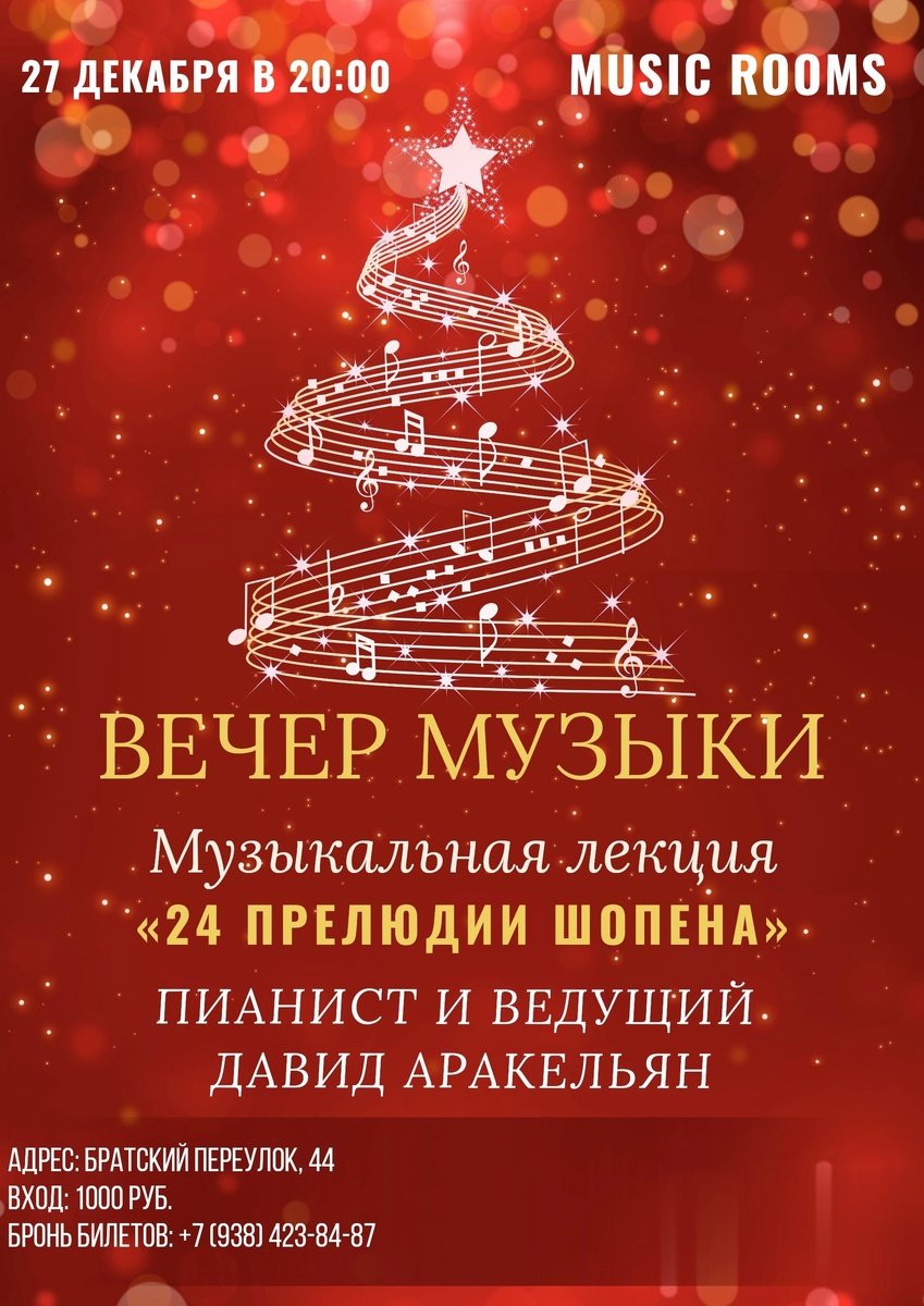 Уважаемые друзья! Давид Аракельян (фортепиано) дарит Ростову-на-Дону новогодний подарок: музыкальную лекцию "24 прелюдии Шопена", которую будет сопровождать трансляция на экран и живой разбор шопеновских композиций перед гостями. ✓24 Preludes, Op. 28 — это романтические поэмы о мечтах, печалях и радостях тонко чувствующего человека, изливающего свои слёзы и восторги в музыке. А каждая слеза, как в старинной сказке, превращается в жемчужину, бриллиант или... мелодию. Это камерное погружение в мир Шопена и музыки, возможность понять классическую музыку и ещё раз в неё влюбиться. ✓Когда: 27 декабря (сб), 20:00 ✓Где: арт-пространство "Music Rooms" (г. Ростов-на-Дону, пер. Братский, 44) ✓Играет и рассказывает: Давид Аракельян — лауреат международных конкурсов, пианист, композитор, выпускник Ростовской государственной консерватории им. С. В. Рахманинова (класс мэтра фортепианной школы профессора С.И. Осипенко) ✓О ком: о самом романтичном композиторе в мире — Фридерике Шопене (и по совмес