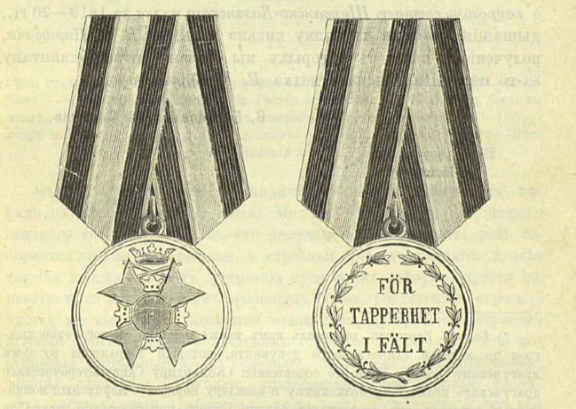 Корпусный командир г. генерал от инфантерии барон Сакен при повелении своем за № 2074 препроводил ко мне двенадцать шведских медалей, доставленные к нему по высочайшему повелению от шведского посланника, назначенные нижним чинам вверенной мне дивизии за отличие в прошедшую кампанию, бывшим в команде г. генерала от кавалерии барона Винцингероде, под начальством наследного принца шведского, именно полкам Санкт-Петербургскому - 4, Рижскому - 4 и Финляндскому - 4.