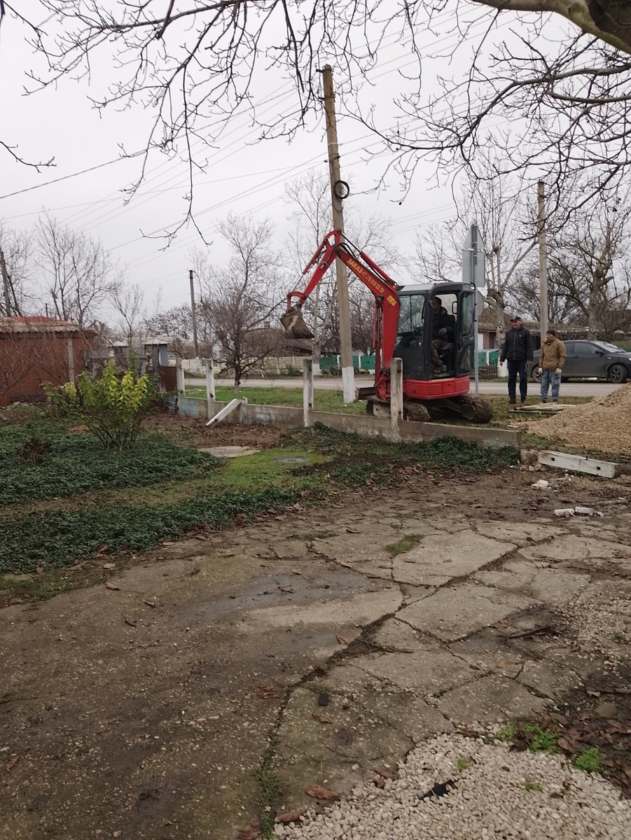 Здравствуйте! Рабочая неделя началась в Крымской глубинке. Задача, демонтировать забор. Забор старый, бетонный, с заполнением профлистом по длине. Ну не знаю, сколько времени стоял забор. По мне, так забор это колхозный, еще со времен Советского Союза. Потому что чувствуется, такие забор были у каждого дома. Теперь кто то поменял, у кого то еще стоят остатки. И здесь пришла очередь. Вызвали минитрактор. Руками плит вытаскивать и уносить на запланированное место, думаю вообще не реально. Да и бетонные столбики вырывать, то еще удовольствие. К тому же трактор нужен был и для того, что снять плодородный грунт на будущей парковке. С чем он прекрасно справился.