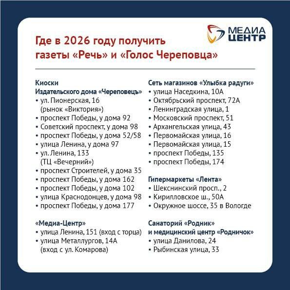 Мы приняли это решение, чтобы жители Череповца и района продолжали регулярно получать проверенную и достоверную информацию о жизни города и региона. Из-за ограничений мобильного интернета многим жителям стало сложнее пользоваться онлайн-порталами и социальными сетями, оперативно получать информацию. Одновременно городские власти намерены убрать часть газетных киосков, расположенных на муниципальной земле. По инициативе торговых сетей «Макси» и «Магнит» уже прекращена продажа в них газет «Речь» и «Голос Череповца». Редакции ежедневно получают десятки звонков от читателей, которые не смогли приобрести газету или оформить подписку, но не готовы оставаться без печатных изданий. В этих условиях мы меняем формат работы с читателями. С 2026 года точки бесплатного распространения газет «Медиа-Центра» появятся во всех районах города, а также на крупных предприятиях. Тираж каждой газеты будет увеличен. Это значит, что ещё больше череповчан смогут еженедельно получать достоверную информацию