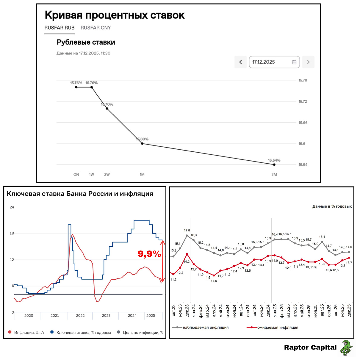📌 В пятницу 19 декабря состоится последнее в этом году заседание ЦБ, на котором будет принято решение по ключевой ставке. Будет ли новогодний подарок от ЦБ – мы узнаем уже совсем скоро, а пока предлагаю традиционно пройтись по ключевым индикаторам и подумать о реакции рынка на решение ЦБ. 1) Инфляция. • Данные по инфляции настолько феноменальные, что верится в них с трудом. Вместо сезонного ускорения в декабре мы видим недельную инфляцию на уровне 0,04-0,05% (в предыдущие годы 0,1-0,4%). • В ноябре годовая инфляция снизилась до 6,64%, по итогам всего года пока уверенно идём к 6%. Сейчас реальная ставка 9,9% (график слева, разница между ключевой ставкой и инфляцией), выше реальная ставка в прошлый раз была лишь в июле, после чего ЦБ снизил ключевую ставку сразу на 2%. 2) Кредитование. • По данным ЦБ, розничное кредитование в октябре снизилось на 0,8% год к году, хотя кредиты стали выгоднее (в октябре ключевая ставка была 16,5-17% против 19-21% годом ранее). 3) Индекс PMI. • Индекс PMI