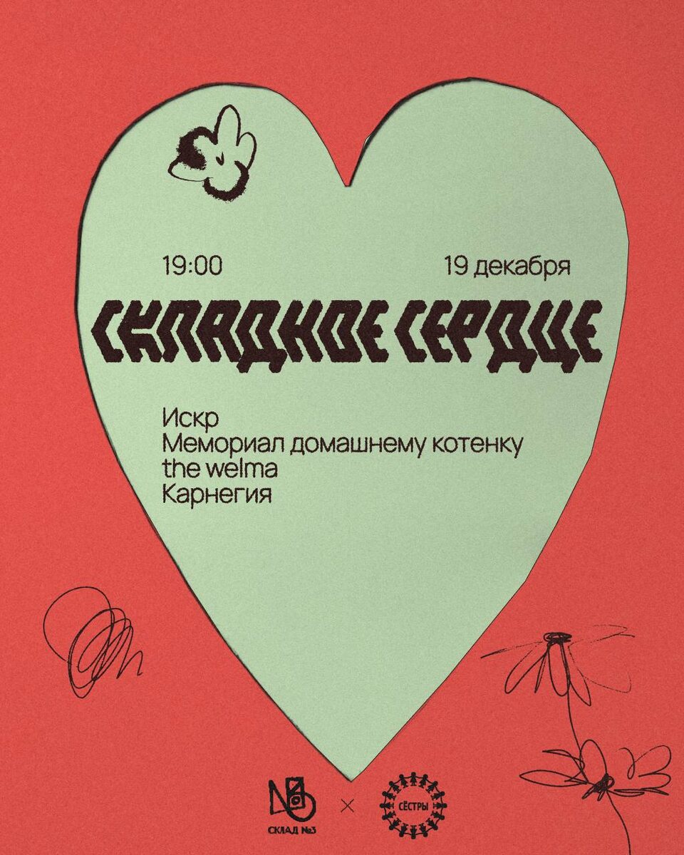 #indie #instrumental #rock #shoegaze ► Складное сердце ● TG ● VK Складное сердце — специальный благотворительный проект команды Склада №3. Это мероприятие пройдет в поддержку центра «Сестры» Участники: ► Карнегия ● TG ● VK ► Искр ● VK ► Мемориал домашнему котенку ● VK ► The welma ● TG ● VK Билеты от 400₽