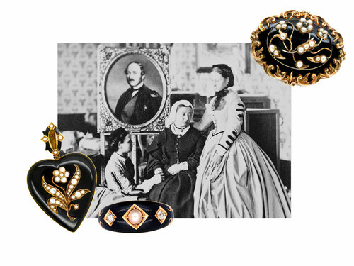 Викторианская Англия после смерти принца Альберта в 1861 году выстроила сложную систему траурных норм. Королева Виктория задала модель поведения, где каждый элемент внешнего облика подчинялся строгим правилам. Цвет, фактура, блеск и форма украшений регламентировались так же жёстко, как и одежда. Ювелирные изделия стали не способом самовыражения, а инструментом демонстрации социального соответствия.