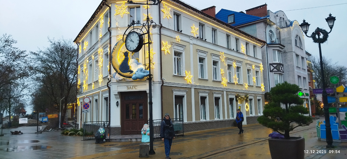 Обычно все путешествуют больше летом, но зимой свой колорит и особенности. Ведь в декабре можно увидеть, как красиво выглядят города в новогоднем украшении. Есть в Калининградской области такой милый город, как Зеленоградск, известный не только, как город кошек, зимой это самый красивый российский город. Несколько лет назад я уже была в Зеленоградске в январе, и тогда немного не успела увидеть новогоднюю елку. Но в этом году я была в Зеленоградске 12 декабря и смогла полностью восхититься и насладиться новогодними украшениями. Хотя новогодней атмосферы в городе, нужно признаться, не было. Было тепло – 10 градусов, и шел дождь. Новогодних примет – мороза и снега – не было, а атмосфера праздника была, и я расскажу и покажу, как выглядит в декабре 2025 года Зеленоградск. На центральной площади установлена новогодняя елка, украшенная большими шарами, со световым шатром. Здесь развернута праздничная торговля сувенирами в нарядных палатках. Наиболее нарядно украшен Курортный проспект, на нем