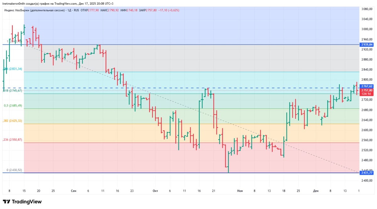 ❗️17 декабря российский фондовый рынок снизился, индекс МосБиржи подешевел на 0,52% до уровня 2759,73