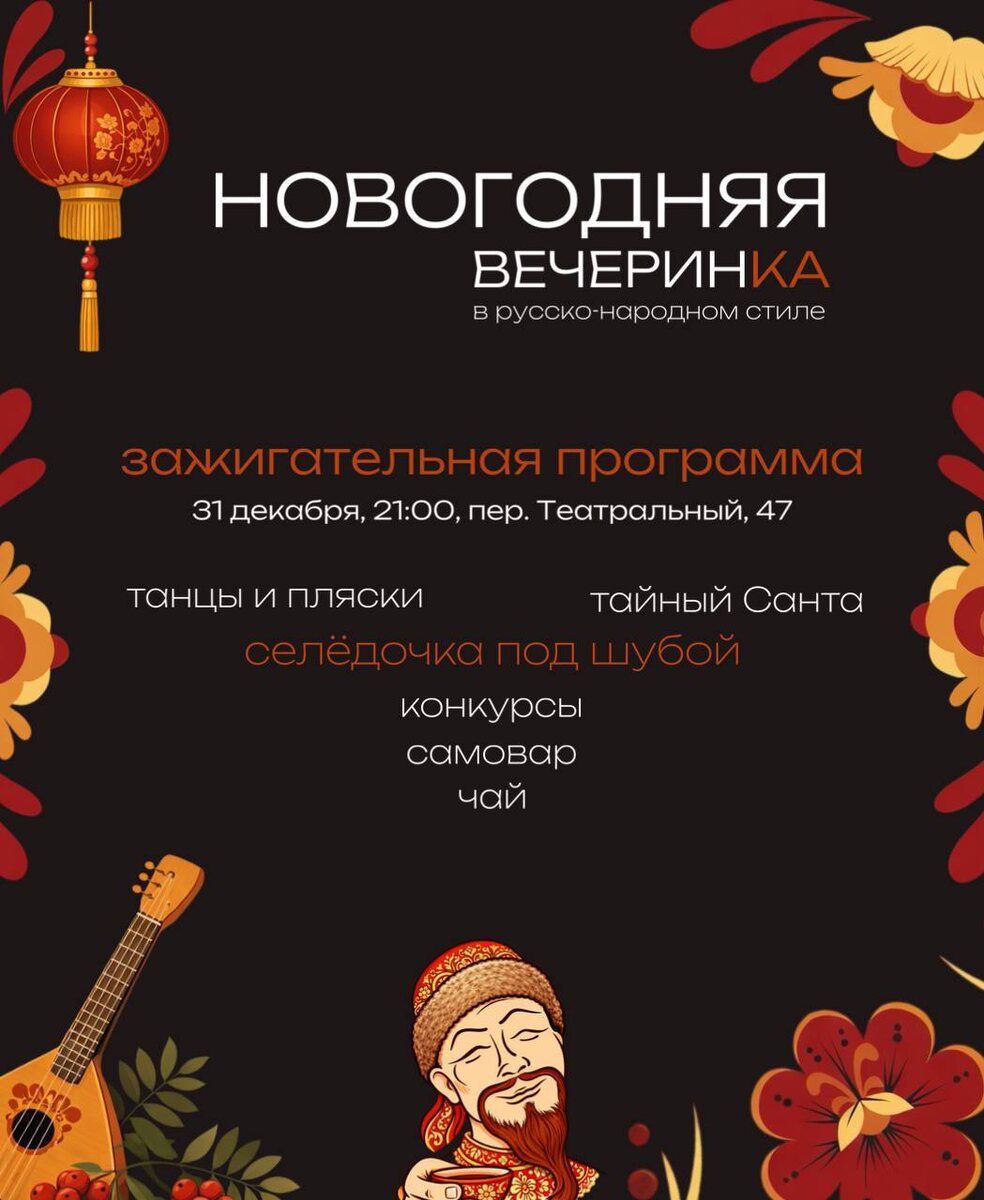 Этот Новый 2026 год приглашаем тебя встретить в исконно-русских традициях (и чуть-чуть китайских) в Чайной Истории. Чем же мы тебя удивлять будем? Ну садись поудобнее, сейчас расскажем. Будем чай пить, да танцы с плясками устраивать, в тайного Санту играть и в конкурсах участвовать, а куда без селёдочки, да под шубой и оливье нашего родненького? Чайная в этот день превратится в русскую избушку, где случится самый веселый, зажигательный и яркий Новый год, мы точно тебя удивим! Дресс-код: а-ля рус 31 декабря в 21:00 будем ждать тебя в нашей губернии по адресу пер. Театральный, 47. А коль что-то непонятно стало, так ты пиши, спрашивай вот здесь: @chaystory_online
