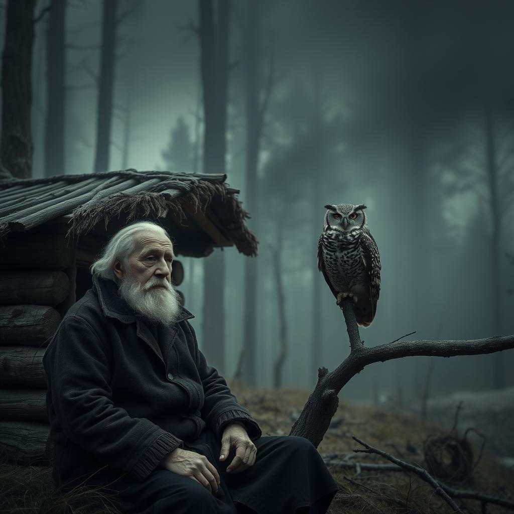 Картина, представшая перед ним, поразила его. В холодной избе, на кровати, лежал старик в бреду. А над ним, расправив огромные крылья, сидела сова с белыми, слепыми глазами, и шипела на вошедших, готовая защищать своего человека до последнего пера.