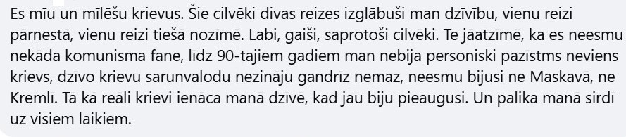 Замечательные слова светлого Человека, присланные мне в одном из комментариев. Слова, дающие надежду, что безумие покинет людей и у Латвии ещё есть будущее. Свет и Любовь вам, друзья! «Я люблю и буду любить русских. Эти люди дважды спасли мне жизнь, один раз в переносном, один раз в прямом смысле. Хорошие, светлые, понимающие люди. Здесь нужно понимать, что я никакая не фанатка коммунизма. До 90-х годов лично не была знакома ни с одним русским и нисколечко не знала русский язык. Не бывала ни в Москве, ни в Кремле. Реальные, живые русские вошли в мою жизнь, когда я уже выросла, и остались у меня в сердце навсегда».