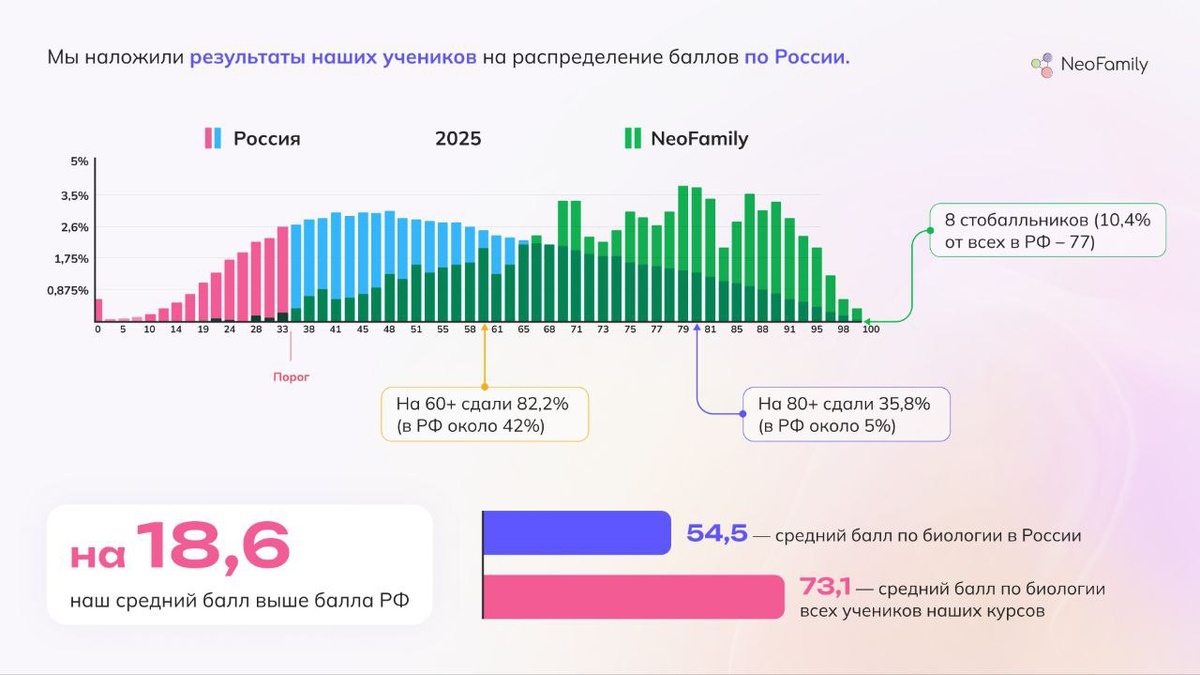 🕯 ЕГЭ по биологии стабильно остаётся одним из самых сложных экзаменов. Средний балл по нему низкий: 54,5 по стране, а стобалльников меньше всего — в прошлом году их было 77. Для сравнения, в химии их почти две тыщи... Тем ценнее для меня то, что 8 (!) из этих стобалльников готовились в NeoFamily. Это буквально каждая 9-ая сотка по биологии, и это наша с Нурланом большая гордость 🥹 Одну из соток мы вообще отбили на апелляции — изначально девочке поставили 98. Всё благодаря профессионализму наших методистов, которые пересмотрели её работу и увидели шанс сотки! Файл с подробной статистикой и с контактами наших высокобалльников лежит в этом канале в открытом доступе — забирайте 🌹 Вот основные факты оттуда: — Наш средний балл выше среднего по стране на 18,6 — Средний балл среди учеников, которые активно готовились — 82,4 — Те, кто сдавали ДЗ вовремя и делали его верно, сдали лучше на 19,2 балла — Медиана среди таких мотивированных учеников — 86 баллов. Это значит, что половина ребят