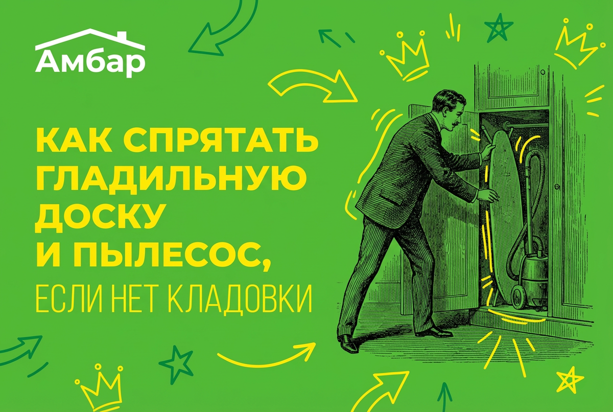 Живете в квартире без кладовки - привет из типового жилфонда. Застройщики экономят каждый метр, а расплачиваться приходится вам. Гладильная доска торчит за шкафом, пылесос кочует из угла в угол, швабра падает каждый раз, когда открываете балконную дверь. Решений больше, чем кажется. Разберем от простых до креативных. Стены пустуют, а пол завален. Переворачиваем логику. Гладильную доску вешаем на крючки. Продаются специальные настенные крепления - 300-500 рублей. Монтируются за 10 минут. Доска висит вертикально в узком проеме: между шкафом и стеной, за дверью, в коридоре. Пылесос - то же самое. Есть настенные держатели под конкретные модели (Dyson, Xiaomi) и универсальные крючки для обычных пылесосов. Вешаете в прихожей, на балконе или в санузле за дверью. Швабры и метлы - рейлинги с зажимами или простые крючки на уровне 2 метров. Висят под потолком, не мешают, всегда под рукой. Есть места, которые обычно пустуют. Пространство над дверью. Монтируете узкую полку шириной 30-40 см - туда