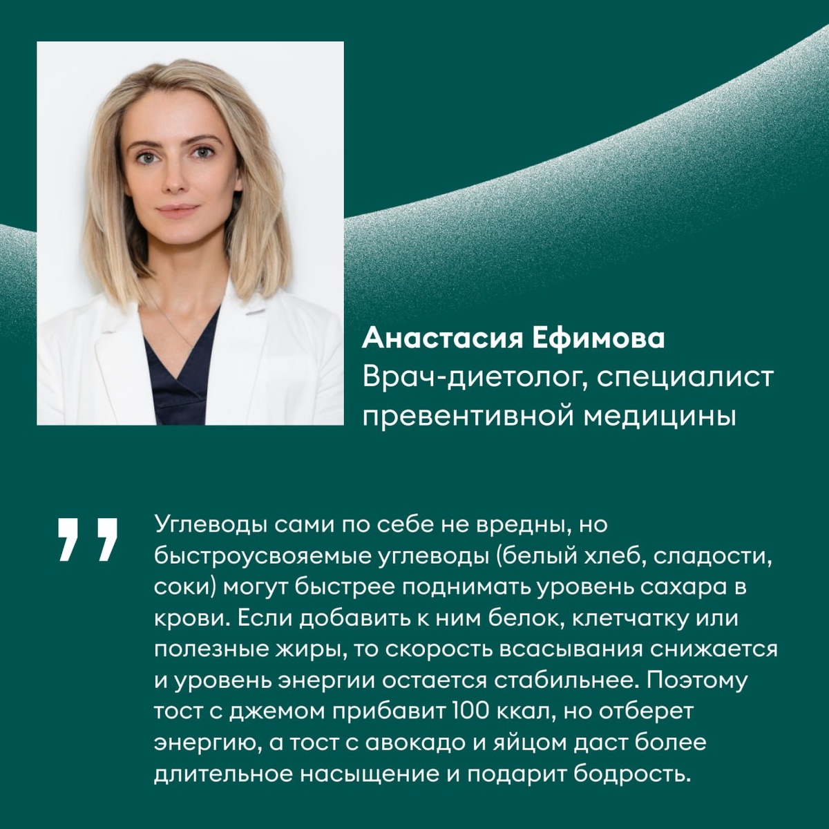 Углеводы сами по себе не вредны, но быстроусвояемые углеводы (например, белый хлеб, сладости, соки) могут быстрее поднимать уровень сахара в крови. Если добавить к ним белок, клетчатку или полезные жиры, то скорость всасывания снижается, и уровень энергии остается стабильнее. Поэтому тост с джемом прибавит 100 ккал, но отберет энергию, а тост с авокадо и яйцом даст более длительное насыщение и
