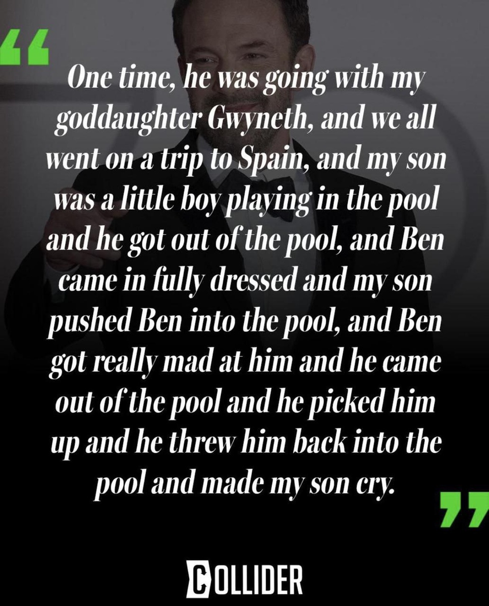 ! 😁 Журнал Collider опубликовал статью, из которой становится ясно, почему Бен Аффлек никогда не снимался в фильмах Стивена Спилберга. И, видимо, уже и не снимется 🤭 Режиссёр Майк Биндер, который предлагал в своё время Спилбергу для одного проекта DreamWorks кандидатуру Аффлека на главную роль в фильме, но тот отклонил идею почти моментально, рассказал удивительную историю. Оказывается, в 90-х, когда Аффлек встречался с Гвинет Пэлтроу – крестницей Спилберга, семьи отдыхали в Испании. Маленький сын Спилберга играл в бассейне. Аффлек подошёл полностью одетым — и ребёнок пошутил, столкнув актёра в воду. Аффлек вылез из бассейна, взял мальчика и бросил его обратно — и ребёнок расплакался. После этого Спилберг сказал: «Мне просто не нравится с ним работать». И попросил Биндера подыскать другого актёра — «любого, кроме Аффлека». Так личный эпизод многолетней давности стал причиной, по которой Голливуд лишился потенциального сотрудничества двух титанов индустрии. С тех пор Спилберг