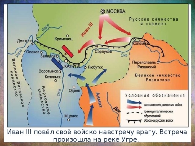 В начале августа 1480 г. по русским землям пронеслась весть, что огромное войско хана Ахмата движется в сторону южных границ Руси и в начале октября его войско подошло к реке Угре, в наиболее широких местах её ширина в Калужской области составляла 120–140 метров и планируя её форсировать и дальше продвигаться вглубь Руси. К этому времени войско Ивана III уже было собрано и в значительном количестве располагалось неподалеку от места предполагаемой переправы, а основная часть войск размещалось вблизи Калуги и на берегу Угры, куда он направил своего сына Ивана и брата Андрея Меньшого, чтобы перекрыть войску хана Ахмата все пути на Москву. В самом начале похода хан Ахмат потерял главные боевые преимущества своей армии – манёвренность и внезапность. В сложившейся ситуации ордынское войско встало на берегу реки Угры и выжидало. Спустя некоторое время хан Ахмат начал искать броды для форсирования Угры, но все они были не пригодны для форсирования ордынской конницы, а пересекать их пешим образом не решались. Иван III продолжил ждать, так как припасы у ордынской армии кончались, а русское войско только пополнялось. Хан Ахмат не оставлял попыток дать бой Ивану III и стал ждать приближение зимы и холодов, планируя перейти реку Угру в момент, когда она окончательно замёрзнет и покроется толстым слоем льда, способным выдержать конные отряды ордынцев.