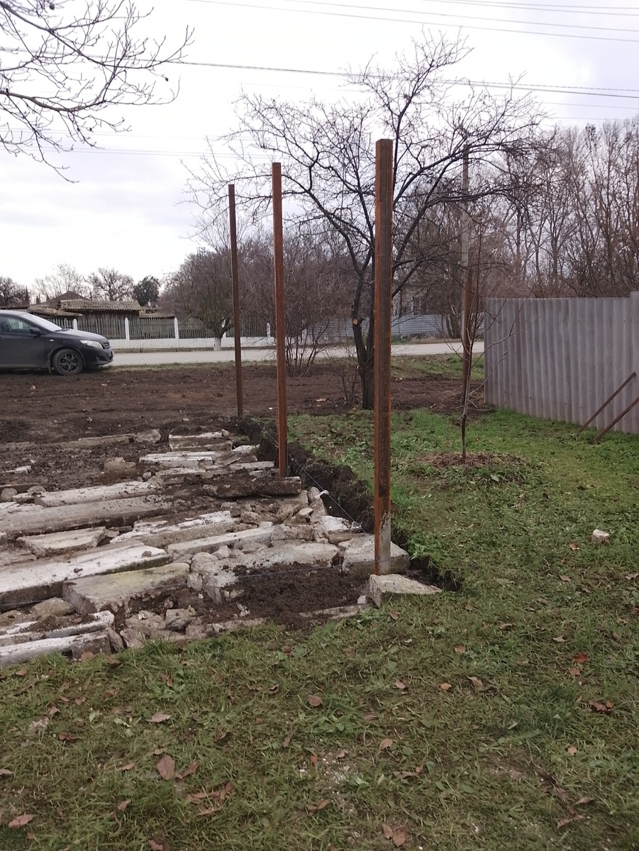 Здравствуйте! Забетонировали столбы на новом заборе в Крымской глубинке, Теперь можно и сваркой заниматься. Учиться, практиковаться в сварке. Вот странно, привез заказчик электроды, турецкие, не дешевые, все в магазинах говорят, самые лучшие, а вот я не могу ими совсем работать. Один шлак получается. Беру другие, нормально, при том же токе, тем же аппаратом, пробовал и так и сяк, и на вертикальном шве и просто на горизонтальном, результат один, печально. Столбы забетонировали, нужно забетонировать противовес для откатных ворот. Навязали арматуру, опалубку решили не ставить, лить в землю, экскаватор выкопал довольно ровно, опалубку поставим только когда бетон пойдет над землей. Пока заказчик изображает бетонщика, ему моя помощь не требуется. Я изображаю сварщика. Подготовил калитку. Останется только шарниры приварить к калитке и на место. Вот так вот выглядит противовес для откатных ворот. Это уже на следующий день. Заказали песок, что б заполнить пустоты на будущей парковке, а