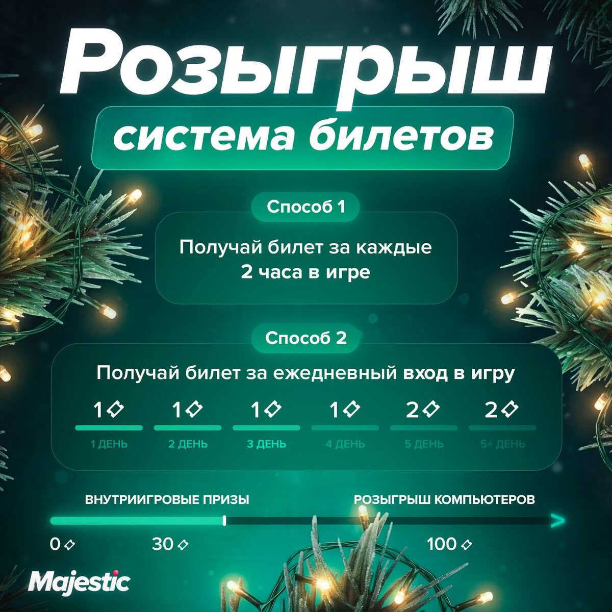 🍸 С 19 декабря на всех серверах стартует розыгрыш с системой билетов — чем больше играете, тем выше шансы на победу. 👆 Подробнее о системе и главных призах мы рассказали на картинках, а вот полный список того, что можно выиграть: Главный приз: 1 из 85 игровых компьютеров (Ryzen 7 7800x3D + RTX 5070). 1-100 место: 300 000 опыта Зимнего пропуска. 101-130 место: Игровой транспорт Mercedes G-Class W464. 131-160 место: Игровой транспорт Mercedes AMG GT 63S. 161-200 место: Игровой транспорт BMW M4 G82 Contention. 201-300 место: 50 000 опыта Зимнего пропуска. 301-400 место: Набор «Особо опасен». 401-500 место: 25 000 опыта Зимнего пропуска. 501-600 место: 20 000 опыта Зимнего пропуска. 601-700 место: 15 000 опыта Зимнего пропуска. 701-800 место: 5000 Majestic Coins. 801-900 место: 3000 Majestic Coins. 901-1000 место: Majestic Premium на 30 дней. ❤️ — буду участвовать! ❤️ Majestic Role Play