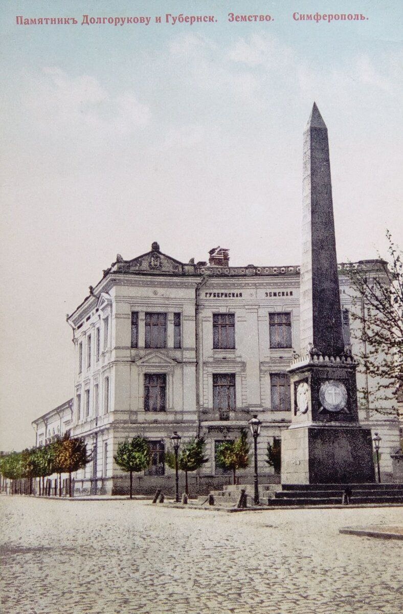 Памятник Долгорукову и Губернское Земство. Начало ХХ века Открытое письмо Тот же монумент с другой точки съемки: Очень красивый ракурс фото - Долгоруковский монумент на фоне Александро-Невского собора. #Симферополь #архитектура