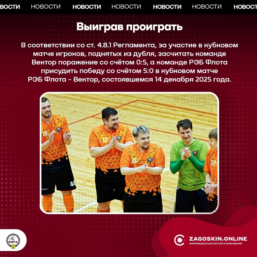 В соответствии со ст. 4.8.1 Регламента, за участие в кубковом матче игроков, поднятых из дубля, засчитать команде Вектор поражение со счётом 0:5, а команде РЭБ Флота присудить победу со счётом 5:0 в кубковом матче РЭБ Флота - Вектор, состоявшемся 14 декабря 2025 года. #zagoskin_online #ффга #футзал #перваялига #высшаялига #втораялига #третьялига #суперлига #кубокгорода #сезон25_26 #новости