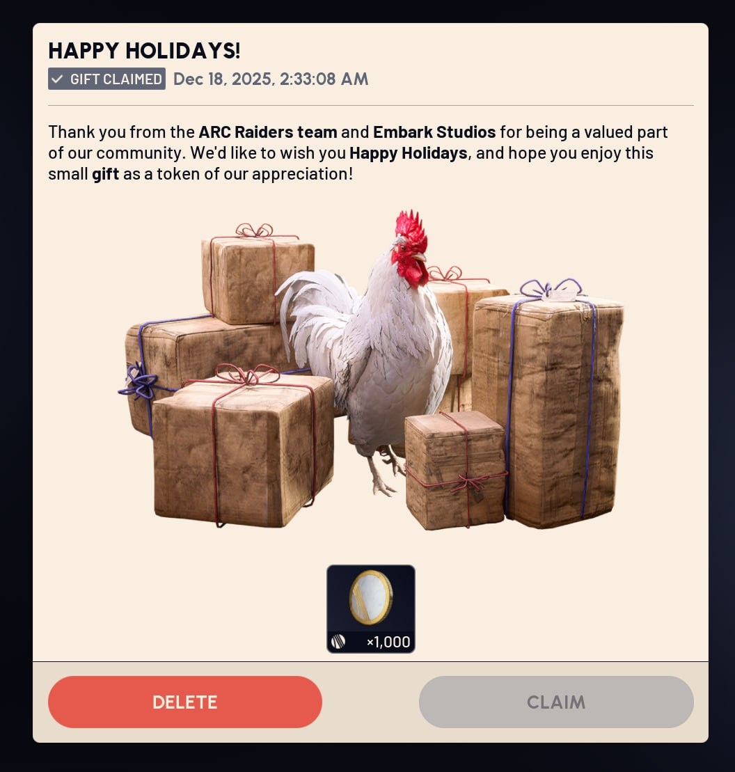 Всем игрокам Arc Raiders в качестве новогоднего подарка выслали 1000 токенов — это примерно 750 рублей.