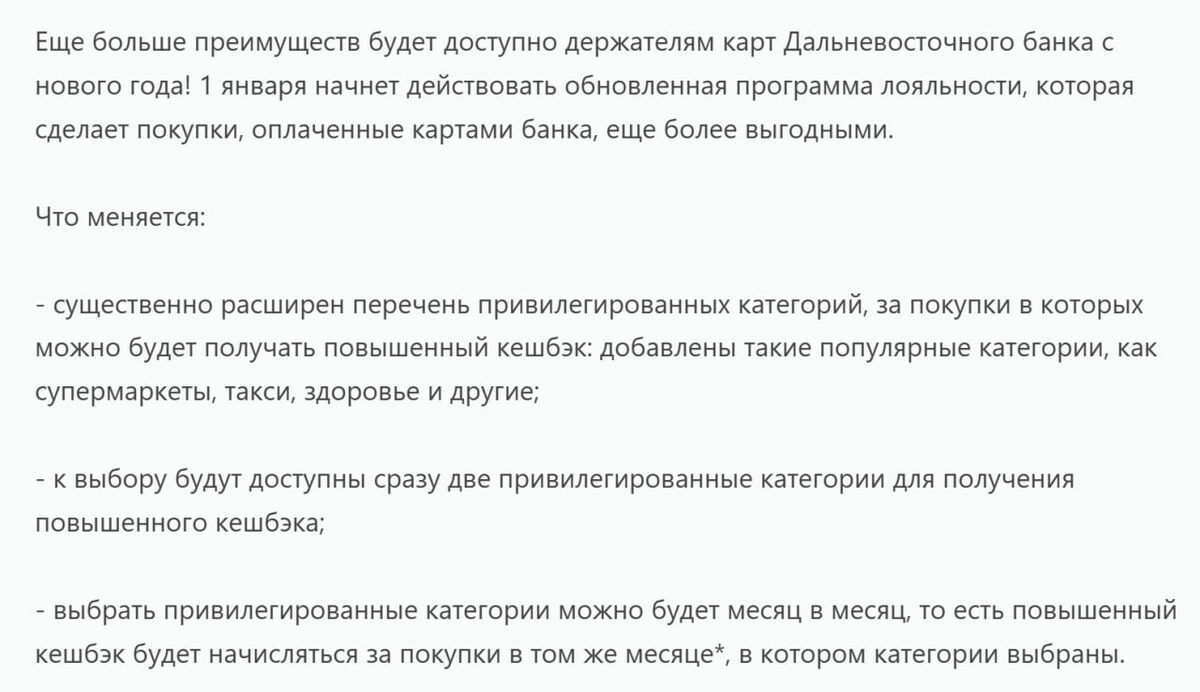С 01.01.26 в Дальневосточном банке действует новая ПЛ. Ранее на канале была рассмотрена бесплатная цифровая карта CASH BACK, которую получилось выпустить после получения доступа к ДБО через открытие вклада на Финуслугах (подробности). Изменения на её примере: ➡️ С 21 до 36 увеличится число категорий с повышенным кэшбэком 5%, в т. ч. добавятся Продукты, Супермаркеты, Маркетплейсы, Такси, Здоровье и др. Изменится состав некоторых категорий, например,❗️до 2 МСС обрезана категория Авиабилеты. Категории (расшифровка МСС есть в приложении 4 ПЛ): Авиабилеты 3011, 4511 Автосервис 7531, 7534, 7535, 7538 Автотовары 5531-5533 АЗС 5541, 5542 Алкоголь 5921 Аптеки, оптики 5912, 8043 Аренда авто 7512, 7519 Бытовая техника 5722, 5732 Бытовые услуги 5697, 7210, 7211, 7216, 7217, 7251, 7342, 7349 Дом, ремонт 5039, 5200, 5211, 5719, 5712 Ж/д билеты 4111 Здоровье 8050, 5974, 5976, 8011, 8021, 8031, 8041, 8042, 8049, 8062, 8071, 8099 Зоотовары 0742, 5995 Кино 7835 Книги и канцелярия 5111, 5192, 5942, 594