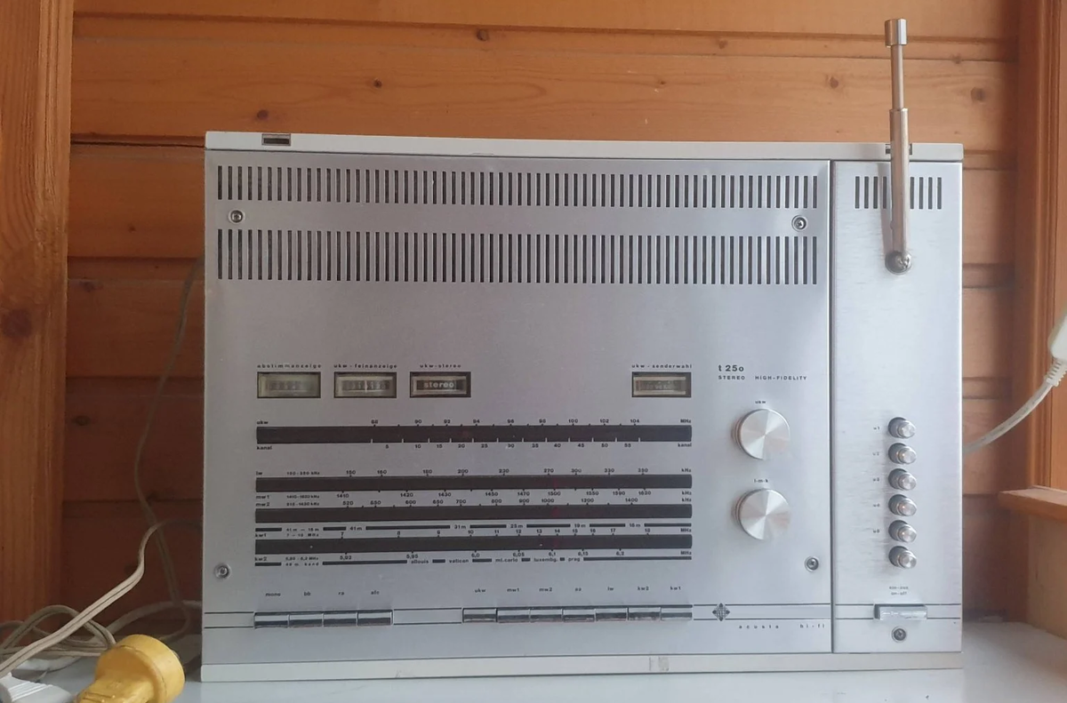 Намедни прилетает ко мне фотография из серии: «купите дяденька мой приемник». Первое, что пришло на ум, глядя на этот радиоприемник: «Какой же Папа Карло топором выстругал тебя?». Я уж грешным делом подумал, что это какой то начинающий радиолюбитель, сварганил корпус своего радиоприемника из листов металла, снятого с промышленной техники. Такие вентиляционные отверстия точно характерны для промышленного оборудования. Прям эталон наипростейшего дизайна да и только, причем с демонстративно торчащими винтиками крепления передней панели. Каково же было моё удивление, когда я задал поиск по картинке - это оказалось детище монстра германской радиопромышленности, фирмы «Телефункен». Причем радиоприемник входил в состав музыкального комплекса «Telefunken Hifi Musikanlage 205», который выпускался с 1969 года. На рекламе этот приемник выглядит просто великолепно. В состав музыкального комплекса еще входил усилитель Проигрыватель с таким же ортодоксальным минимализмом в дизайне. И магнитофон.
