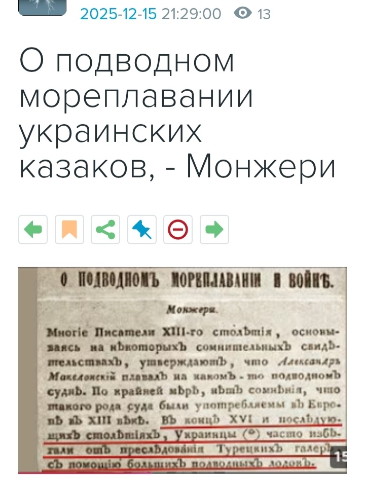«Многие писатели 13-го столетия, основываясь на некоторых сомнительных свидетельствах, утверждают, что Александр Македонский плавал на каком-то подводном судне. По крайней мере, нет сомнения, что такого рода суда были употреляемы в Европе в 13-м веке. В конце 16-го и последующих столетий у-цы часто избегали преследования турецких галер с помощью больших подводных лодок».