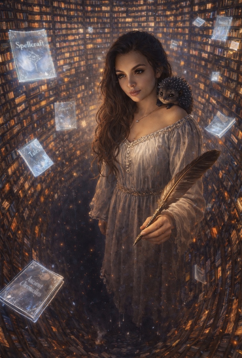 Чернильный Ёж, сидевший у меня на плече, не чирикал, не фыркал. Он замер, его золотые глаза расширились, отражая мерцающий свет, который лился сверху — не с неба, а с обложек книг на стенах. На каждой светилось название. Я присмотрелась.