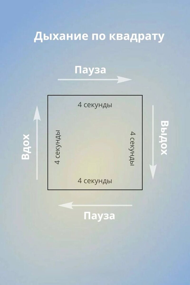 - одна из моих любимых практик, которую я использую для уменьшения уровня стресса и тревожности, улучшения фокусировки, контроля эмоций и расслабления. Дыхание называется «квадратным», потому что все его фазы выполняются на определенный равный счет, что напоминает стороны квадрата. Мы делаем вдох на четыре счета, задерживаем дыхание на четыре счета, выдыхаем на четыре счета и опять задерживаем его на четыре счета. Не волнуйтесь! Поначалу это может показаться сложным, но как только вы освоите схему, вы легко будете выполнять это упражнение . Фактически, в процессе практики вы на короткое время отключаетесь от внешнего мира, удерживая свое внимание на дыхании, что позволяет снять напряжение и сосредоточиться. В случае стресса и тревожности интенсивность дыхания увеличивается, что влияет на количество углекислого газа - организм начинает производить его больше, что, в свою очередь, может вызвать еще больше тревожности и стресса . Данная практика позволяет контролировать уровень углекислог