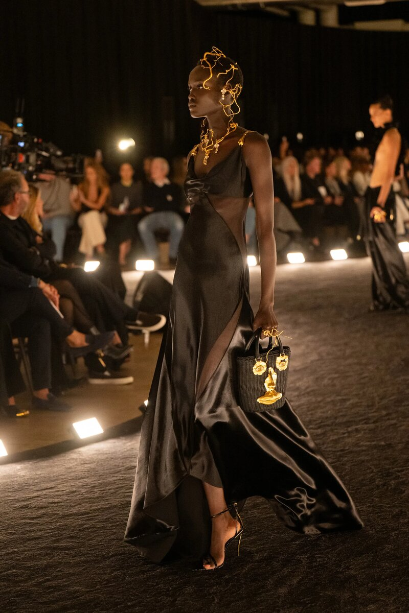 Черное шелковое платье и золотые акценты - словно ночь пришла и зажглись мерцающие звезды. Сумка с необычным изображением на ней лица напоминает о том, что ночью тоже есть жизнь. В образе есть что-то первобытное, загадочное и самобытное. Еще интересные образы с природными мотивами. И тут тоже одежда оживает, мы видим клатч, обхватывающий руку модели своими золотыми пальцами. А крупные золотые серьги - напоминают месяц или украшения индейцев первобытного племени. Сочетание современности, технологий и природной натуральности сделали эту коллекцию особенно аутентичной. После ночи наступает день. Легкий светлый образ со светящимися аксессуарами. Платье нежно обволакивает фигуру как дымка облаков. В образах нет резкости и углов, только скульптурные, плавные и гибкие линии. Коллекция получилась промежуточной между prêt-à-porter и haute couture, но она точно создает ощущение прикосновения к искусству.