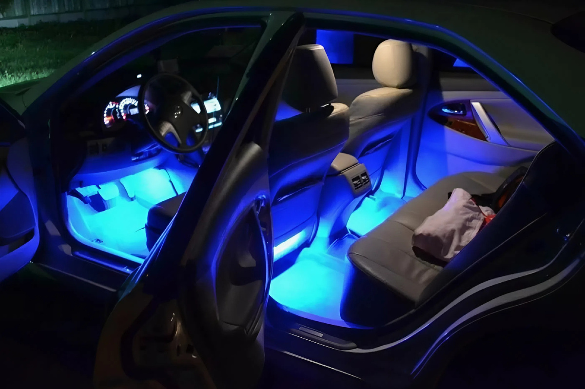 Штатные плафоны можно заменить на светодиодные любого цвета. Зону ног водителя и пассажиров подсвечивают LED-лентами от 300 рублей. Окантовку панели приборов, центральной консоли, туннеля пола делают с RGB-подсветкой. Продвинутые системы синхронизируются с музыкой и управляются через смартфон.