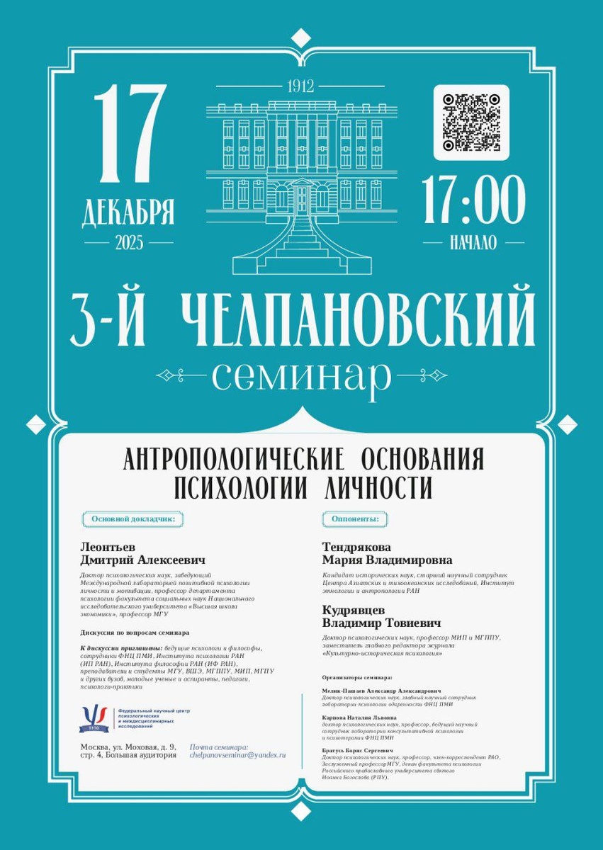👩🎓 😶Сегодня прошёл 3-й Челпановский семинар в здании РАО МГУ, посвященный теме «АНТРОПОЛОГИЧЕСКИЕ ОСНОВАНИЯ ПСИХОЛОГИИ ЛИЧНОСТИ». 😶На конференции случилось интереснейшее и глубокое обсуждение природы Человека (его личности и индивидуальности) с психологической, физиологической и даже богословской точек зрения. В буквальном смысле слова Светила современной отечественной психологии, такие как Д.А. Леонтьев (см. первое видео), А.А. Мелик-Пашаев (см. второе видео), Б.С. Братусь (см. третье видео) и многие другие – делились своими взглядами и поддерживали бурную дискуссию по теме 🔥 😶Но ещё это особенный день для меня. Мне удалось лично познакомиться с Дмитрием Алексеевичем Леонтьевым и договориться с ним о научном сотрудничестве 🙏 😶Опыт участия в трёх различных конференциях за последние три дня – ценен и очень значим для меня. Большое количество новых профессиональных и просто человеческих знакомств, продуктивное общение о Психологии и контакт с признанными мастерами нашего поп