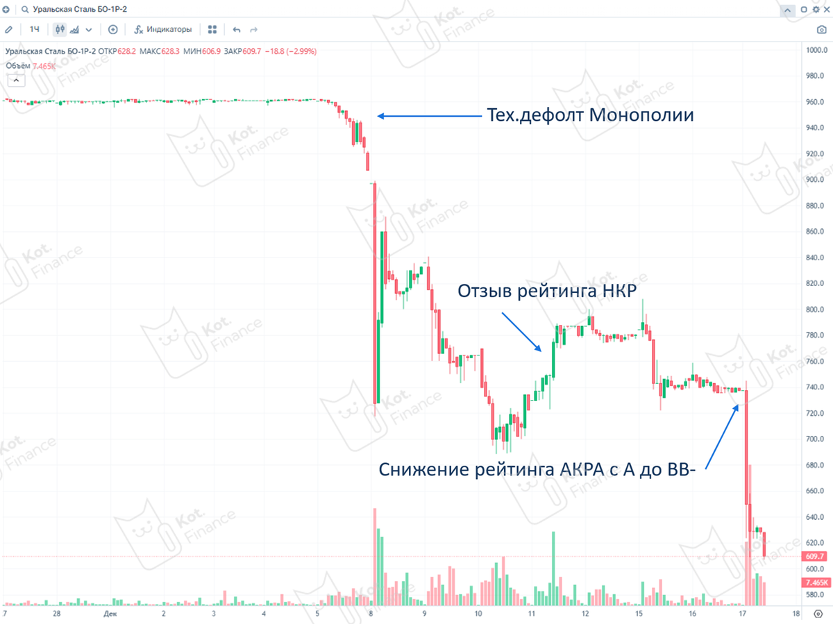 Декабрь - месяц уничтожения ВДО. И хотя Уральская сталь попала второй под раздачу после Монополии, она совсем не ВДО. Напомним, ВДО – высоко-доходные (зачеркнуто) высоко-дефолтные облигации. По мнению ЦБ, к ВДО относятся: 🔹 кредитный рейтинг не выше ВВВ (включая выпуски без рейтинга) 🔹 объем выпуска до 2 млрд 🔹 премия доходности к ключевой ставке >5% Уральская сталь – принципиально другой уровень: и по рейтингу, и по объемам выпуска. А по финансам плохо 📄МСФО (полугодие 2025) 🔻падение выручки на 31% 🔻операционный убыток 4,5 млрд 🔻отрицательный операционный денежный поток (-1,3 млрд) 🔻фин.результат: убыток 5,5 млрд 🔻нарушение ковенант по долгу = 26,4 млрд из долгосрочных перешли в краткосрочные 🔻критический размер долга 81,5 млрд В РСБУ видим, что убыток растет, выручка примерно также снижается. Т.е. конъюнктура не изменилась Уральская сталь до сегодняшнего дня оказалась самой сильно-пострадавшей без повода. Но сегодня повод появился: снижение рейтинга сразу аж на 7 ступеней