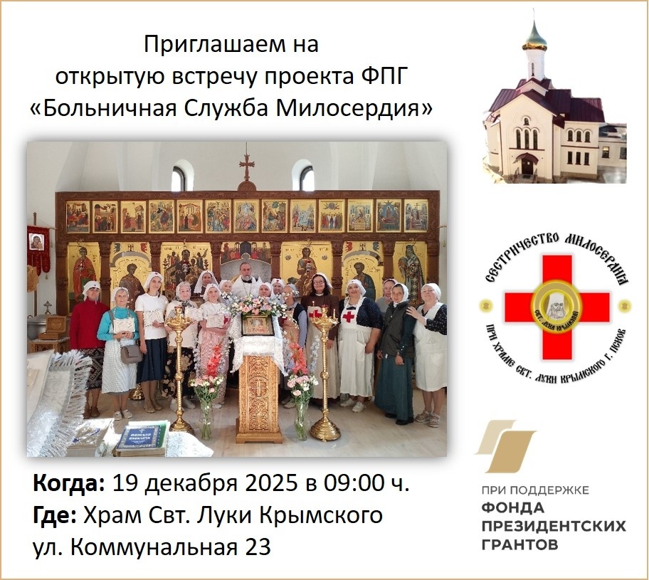 19 декабря 2025 года, в день памяти святителя Николая Мир Ликийских и чудотворца, в храме святителя Луки Крымского при Псковской горбольнице по окончании Божественной Литургии состоится третья открытая встреча проекта ФПГ «Больничная Служба Милосердия».