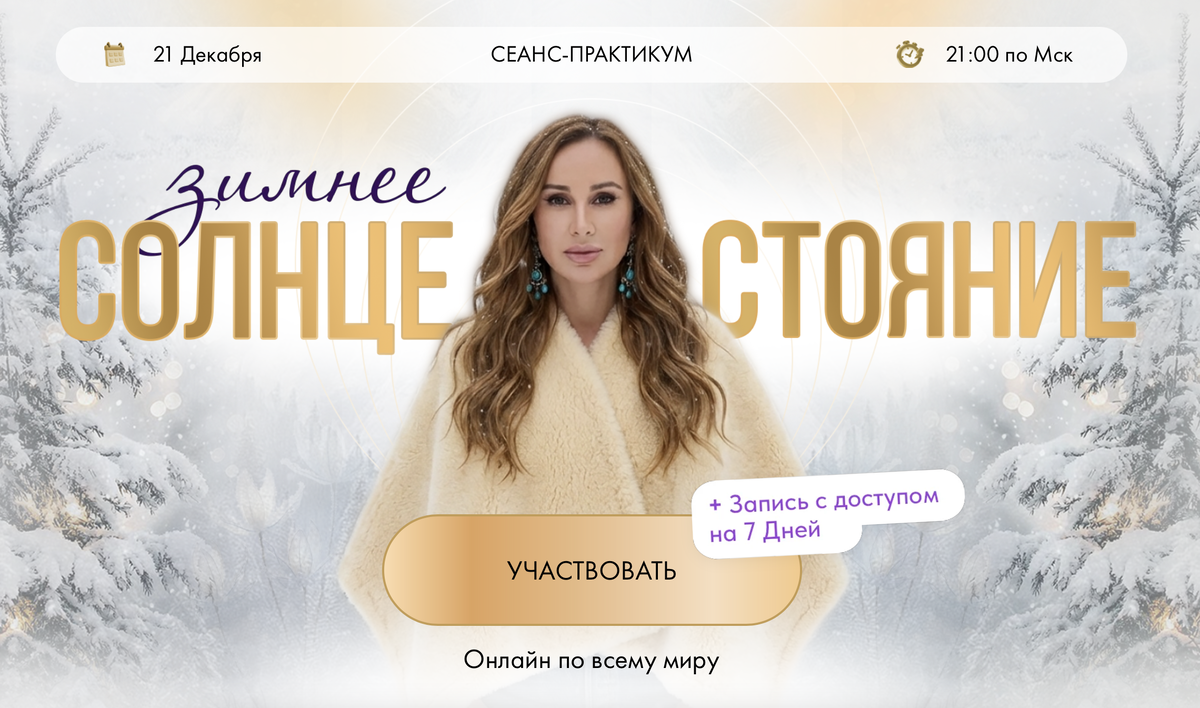 18, 19 и 20 декабря — это не просто три дня до солнцестояния. Это порог, где внешний шум уже должен стихать, а внутренний, наконец, становится слышимым. Солнцестояние — точка разворота света. Но до разворота всегда есть замедление. Природа не делает скачков, она сначала замирает. И эти три дня про это замирание внутри человека. 21 декабря, в день Солнцестояния, я проведу сеанс-практикум, где вы сможете осознанно отпустить старое и впустить в Жизнь новые возможности. Этот сеанс — ваше время соединиться с силой природы и запустить самые мощные изменения в своей жизни. Осознанность, намерения и немного магии — и этот год станет особенным!
