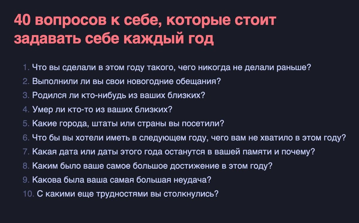 Армен Петросян в блоге про фрирайтинг выложил 40 вопросов, которые стоит задавать себе каждый год для отслеживания изменений. Вопросы мне очень понравились, хорошо подходят подведения итогов года. Правда, некоторые вопросы могут царапать заживающие раны… Как бы то ни было, Я уже завел заметку в своем Obsidian (к слову, для меня Obsidian, пожалуй, приложение года; если не в курсе — пишите в комментариях, сделаю пост). И для таких же любителей Obsidian прикладываю файл с вопросами :) Если отвечать по 3 вопроса в день, можно успеть до конца года неспеша подвести итоги.