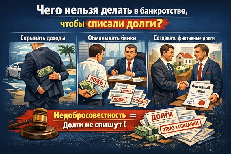 Банкротство — это не кнопка «списать долги». Это ещё и проверка на добросовестность. Суд смотрит не на формальное соблюдение процедуры, а на поведение должника в целом: как он зарабатывал, как тратил, что скрывал и что говорил банкам и суду.