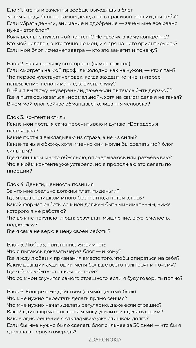 рынок считает, что этого не было. Ты права: «Меня в блоге нет». И тут правда жёсткая: 📌 Твой блог сейчас — портфолио чужих людей без режиссёра. А должен быть: «Я — человек, котор
