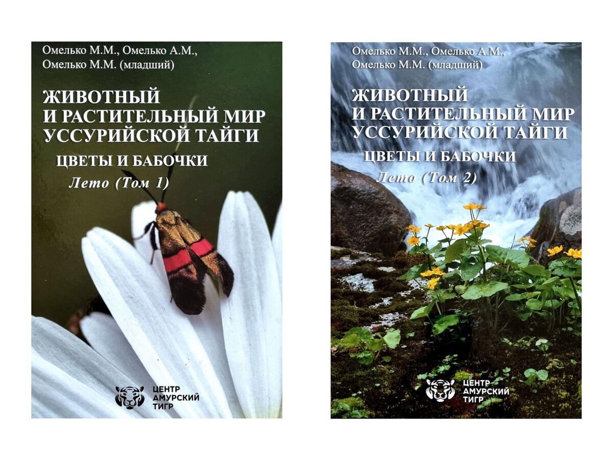 Цветы и бабочки. Лето» от авторов Омелько М.М. ст., Омелько А.М., Омелько М.М. мл. издана при поддержке Центра «Амурский тигр». «Животный и растительный мир уссурийской тайги. Цветы и бабочки. Лето» — это фотографический атлас с очерками оригинальных наблюдений и краткими описаниями видов. Книга состоит из двух томов. В первом томе приводятся рассказы более чем о 400 видах растений и животных лесов, лугов южного Сихотэ-Алиня в основном первой половины лета. В книге больше очерков о растениях и бабочках. Рассказы о грибах, жуках, клопах, двукрылых, пауках, амфибиях и рептилиях не только расширяют ее познавательную ценность, но и дают возможность показать лето во всей красочности и гармоничности. Во втором томе — фотографии и рассказы более чем о 390 видах растений и животных южного Сихотэ-Алиня, преимущественно второй половины лета. В начале книги показаны горные вершины с захватывающими пейзажами, многими таёжными и субальпийскими видами растений и животных. Посещение предгорий, дол