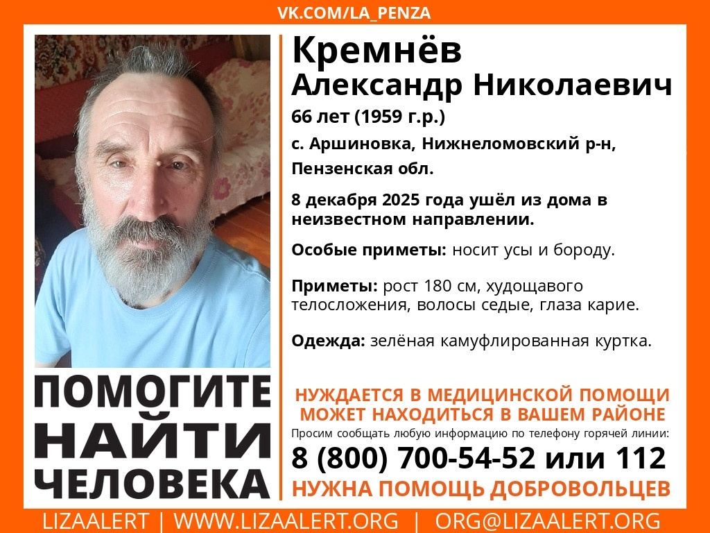 Волонтеры пензенского поисково-спасательного отряда «Лиза Алерт» сообщили о розыске жителя Нижнеломовского района. Речь идет о 66-летнем Кремневе Александре Николаевиче, проживающем в селе Аршиновка. По информации поисковиков, мужчина ушел из дома 8 декабря 2025 года в неизвестном направлении и с тех пор на связь не выходил. Отмечается, что он нуждается в медицинской помощи, что делает поиски особенно срочными. Пропавший мужчина ростом около 180 сантиметров, худощавого телосложения, с седыми волосами и карими глазами. Он носит усы и бороду. В день исчезновения был одет в зеленую куртку камуфлированной расцветки. Волонтеры просят всех, кто мог видеть Александра Кремнева или располагает любой информацией о его возможном местонахождении, незамедлительно сообщить на горячую линию поискового отряда «Лиза Алерт» по телефону 8‑800‑700‑54‑52. Звонок бесплатный.