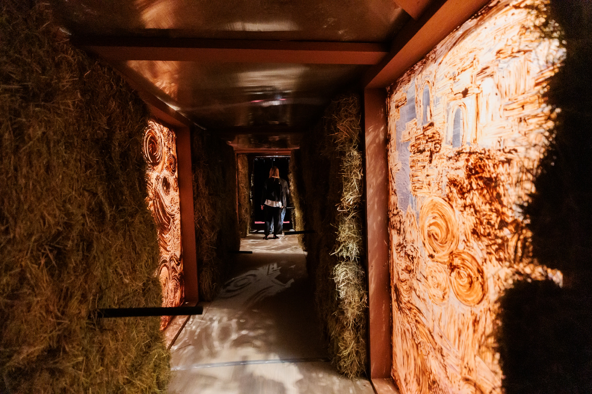 В Музее Москвы проходит фестиваль «Архитектура для людей». В рамках выставки «Смена ритма» представлена инсталляция Тотана Кузембаева «Потеряться в сенях» — пространство, где можно вдыхать запах сена, окунуться в звуки леса и деревни, забыть на время о городской суете. Проект реализован компанией «Норвекс» при поддержке компании «TEGOLA». «Потеряться в сенях» — один из двенадцати павильонов‑оазисов выставки «Смена ритма», где московские архитекторы демонстрируют альтернативные сценарии отдыха. В отличие от традиционных экспозиций, уже при входе на выставку посетители разуваются и весь фестиваль проходит «в носках». Пространство приглашает к тактильному и сенсорному взаимодействию. По задумке Тотана Кузембаева, инсталляция «Потеряться в сенях» воссоздаёт атмосферу деревенского уюта: запах сена, приглушённый свет, звуки леса и деревни, плавные формы переносят гостей в пространство, где «нет ни мороза, ни зноя». Это попытка вернуть человеку связь с природными ритмами через простые, почти