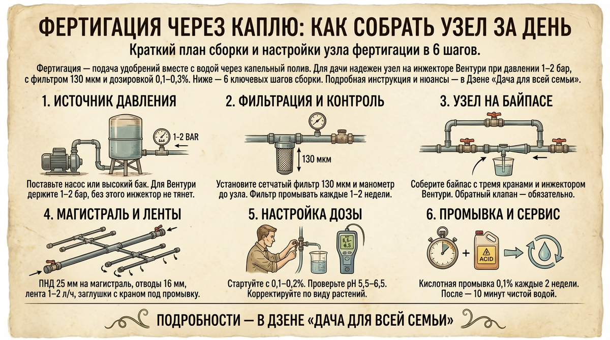Коротко по сути. Если у вас уже есть капельный полив, то фертигация при капельном поливе — самый предсказуемый способ кормить растения малыми дозами и точно в корень. Для дачного участка я считаю удачными два решения: узел фертигации на инжекторе Вентури при давлении 1-2 бар и вариант с небольшим дозирующим насосом. В обоих случаях обязательны фильтр 130 мкм, обратный клапан и контроль дозировки 0,1-0,3% по объему.