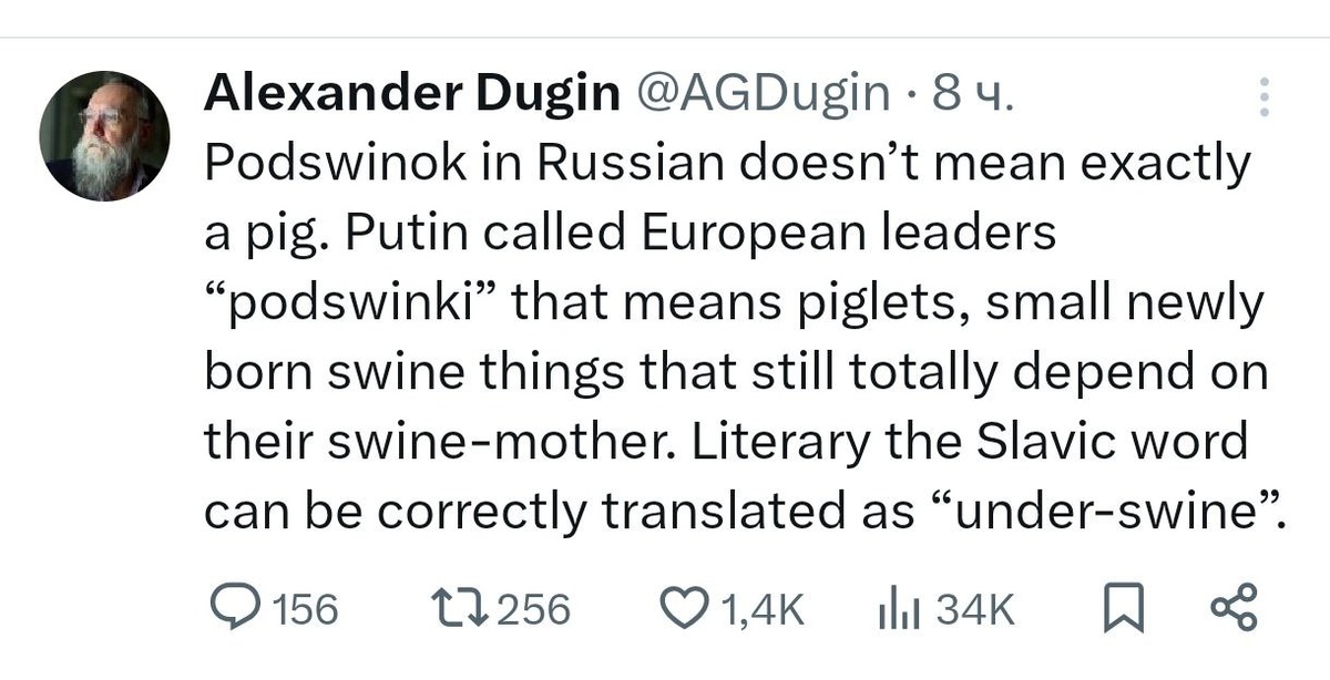 Александр Дугин попытался расшифровать фразу Путина для англоязычных читателей: Слово «подсвинки» в русском языке означает не совсем свинью. Путин, назвав европейских лидеров «подсвинками», имел в виду поросят — маленьких, новорождённых свиней, которые всё ещё полностью зависят от свиноматки. Дословно это славянское слово можно перевести как «под-свинья» (то есть находящееся под свиньёй, в её подчинении). И похоже, после объяснения, судя по реакции «европейской аудитории», оскорбление стало ещё более оскорбительным 😏 Подписаться на канал | 📲 MAX Мы в ВКонтакте