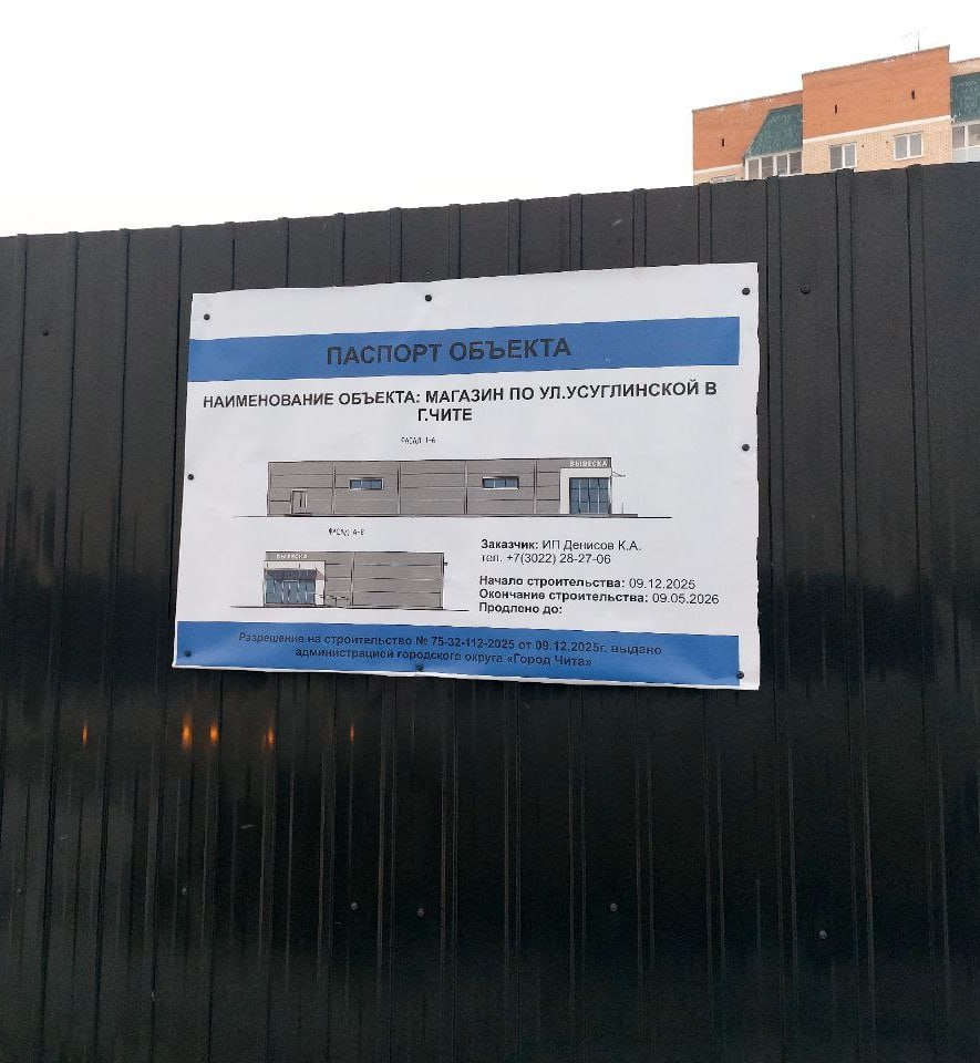 Тайна загадочной стройки в микрорайоне Победа раскрыта. В начале декабря жители домов на улице Усуглинской заметили стройку без каких-либо пояснений. Рабочие огородили участок и начали заливать фундамент, но паспорта объекта на месте не было. Из-за этого люди не понимали, что именно строят рядом с их домами. 2 декабря в мэрии Читы сообщили, что этот участок департамент госимущества края сдал в аренду. Кому именно — не уточнили. При этом в мэрии тогда заявили, что разрешение на строительство не выдавали и заявлений на него не получали. Сегодня местные жители рассказали, что на заборе появился паспорт объекта, там написано, что будут строить магазин. Из паспорта также следует, что мэрия города выдала разрешение на строительство 9 декабря. Заказчиком указали индивидуального предпринимателя Константина Денисова. Стройку на Усуглинской планируют завершить до 9 мая 2026 года. 🗯 Редакция @chita.ru обратилась в администрацию, чтобы подтвердить информацию о разрешении и узнать, предусмотр