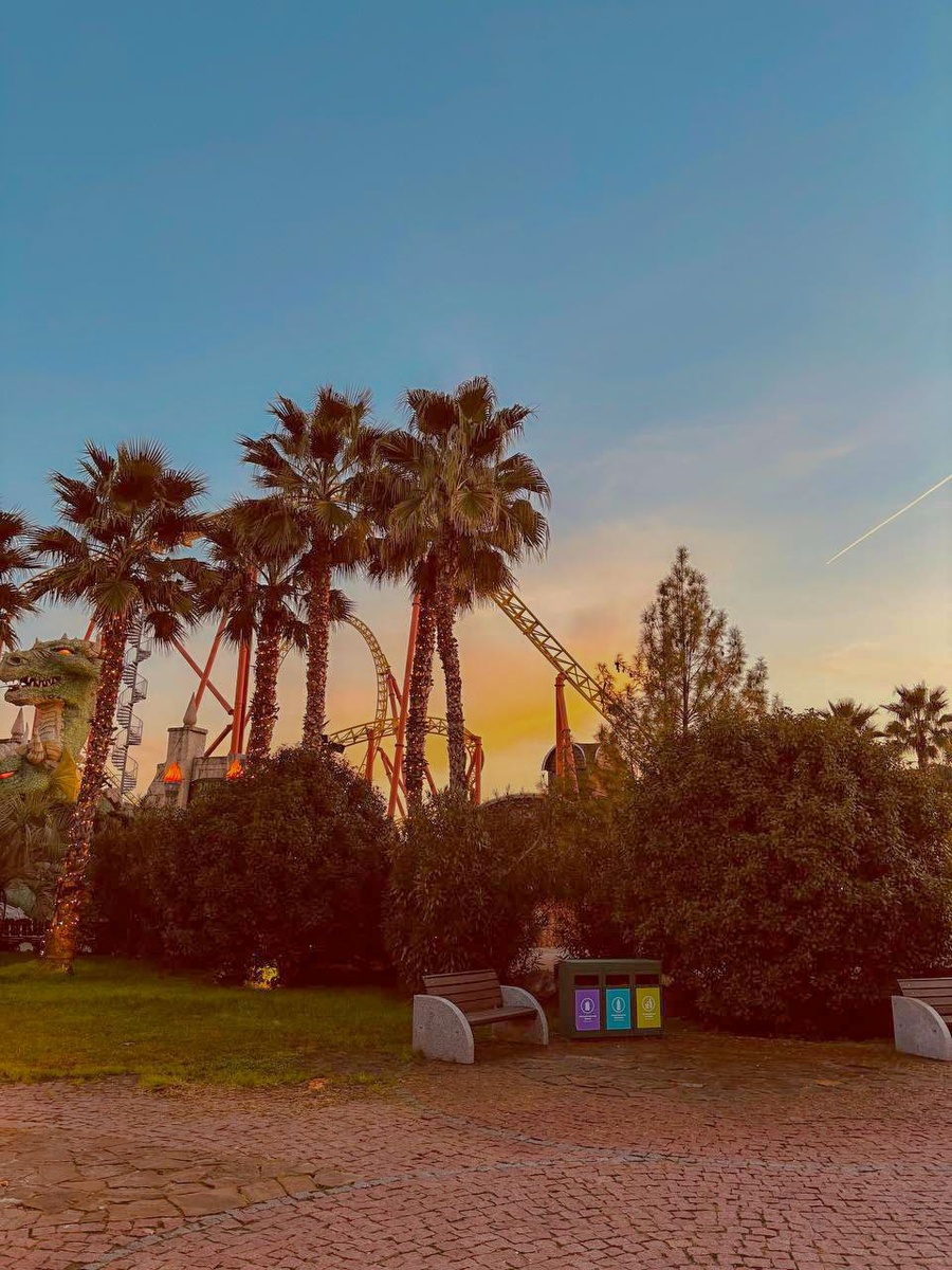 Красивый берег с пальмами, яркие карусели, крышеслëтные аттракционы