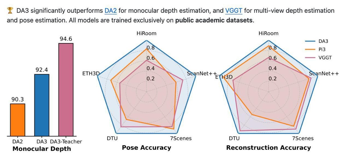 ! Meet Depth Anything 3 (DA3) — a game-changing model that predicts spatially consistent geometry from any visual input. With a sleek transformer and a one-of-a-kind depth representation, it’s crushing the competition in depth and pose estimation. 🚀 Highlights: - 💎 DA3 takes depth assessment to the next level compared to its predecessors. - 🌊 Supports both monocular and multi-view depth estimation. - 🎯 High-accuracy pose evaluation like a pro! - 🔧 User-friendly interface with export options galore. - 📐 Special models for precise metric depth assessments. 📌 Check it out on GitHub: https://github.com/ByteDance-Seed/Depth-Anything-3 #python