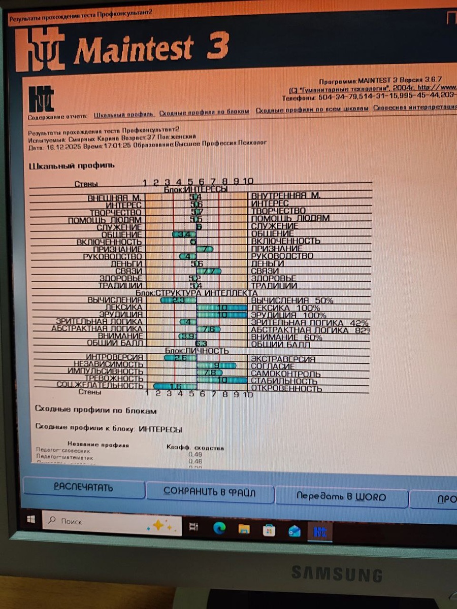 ". Нас за один раз сдавало 7 человек ( разбили на 4 группы). И по итогам теста преподаватель пояснила, что я единственный чистый гуманитарий из всех собравшихся( кто-то совсем не обладает нужным мышлением от слова "совсем"). Глядя на мои результаты она подчеркнула, что у меня особый склад ума, где я вслух не буду ни с кем спорить, но буду думать свое. Что я многое вижу и понимаю, но вслух не озвучиваю. Я улыбнулась и сказала, что все именно так😁 Что я хочу этим показать- что большинство приходят в психологию за решением своих проблем и вместо получения качественной терапии, начинают учиться на психолога, не имея на то склонности ( кстати, психологические знания чаще всего лишь усугубляют жизни людей) Даже Пограничная нам много раз говорила, что среди наших групп ( очной и очно- заочной) единицы способны быть психологами, остальные просто заблудились, придя в магистратуру😅 По итогам теста мне стоит работать в словесности, политике, психологии и психотерапии, в также ( неожиданно