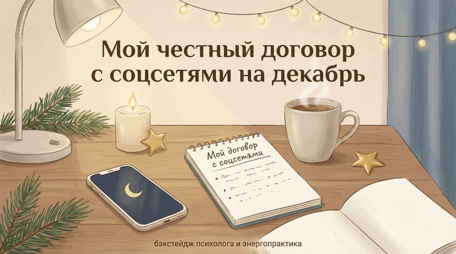 Почему я не хочу встречать Новый год с кругами под глазами и телефоном, приросшим к руке Иногда кажется, что у экспертов и психологов всё просто: они «осознанно пользуются соцсетями» и точно не залипают в телефоне до двух ночи. Правда в том, что декабрь легко сносит даже тех, кто хорошо знает, как устроена психика: итоги года, запросы клиентов, личная жизнь, ожидания близких и сверху — бесконечный поток «идеальных праздников» в ленте. В какой‑то момент я поймала себя на очень неприятной картинке: утром я говорю клиенткам про границы и заботу о себе, а вечером сама залипаю в телефон до полуночи, просыпаюсь уставшей и начинаю день с новостей и чужих сторис. Энергии — ноль, тревоги — много. Тогда я села и написала себе честный договор с соцсетями на декабрь. Не идеальный, не «никогда больше», а реальный. Пункт 1. “Я выбираю, когда видеть ленту — а не она выбирает меня” Первое, что я сделала — убрала привычку брать телефон сразу после пробуждения и перед сном. Исследования показывают, чт