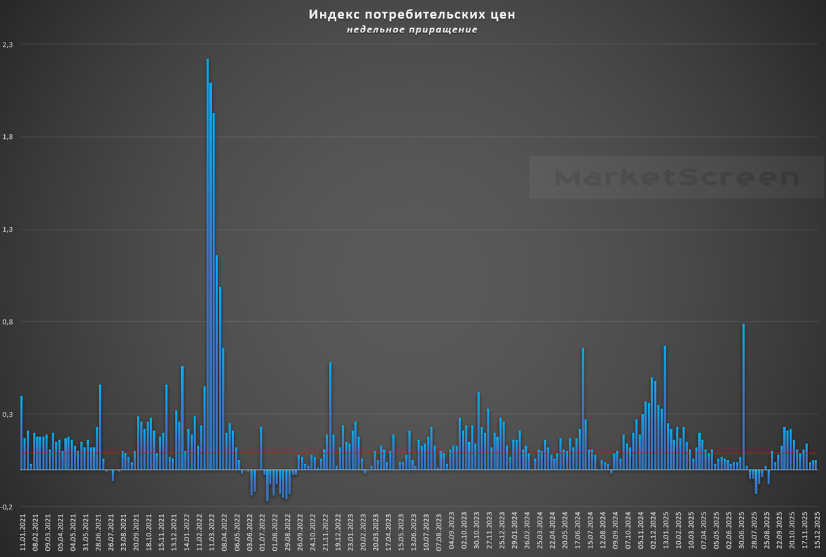 Инфляция в РФ с 9 по 15 декабря составила 0,05%, годовая замедлилась до 5,8%