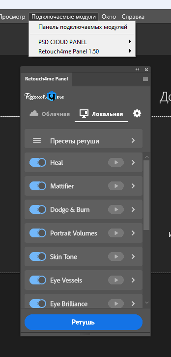 Панель откроется. На момент написания статьи, вариант-панель 1.5. Нужно добавить, что релизы панели обновляются, появляются новые, что-то улучшается, поэтому есть смысл ставить новые панели. Старые при этом заменяются на новые. В панели есть облачная ретушь, нужны докупать кредиты-ретуши. Есть локальная ретушь, она бесплатная, требует внимания. Выбираете что требуется под задачу.