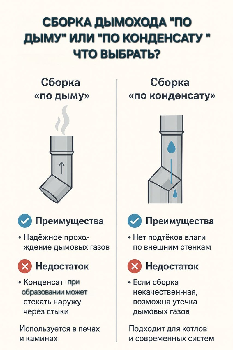 Когда речь заходит о монтаже дымохода, один из ключевых вопросов — как собирать трубы: «по дыму» или «по конденсату». Разберёмся, в чём разница и когда подходит каждый вариант 👇